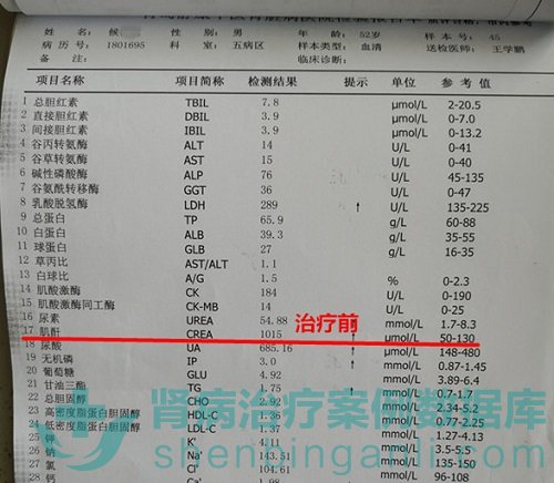 肌酐由1015umol/L,血红蛋白由65g/L,贫血严重