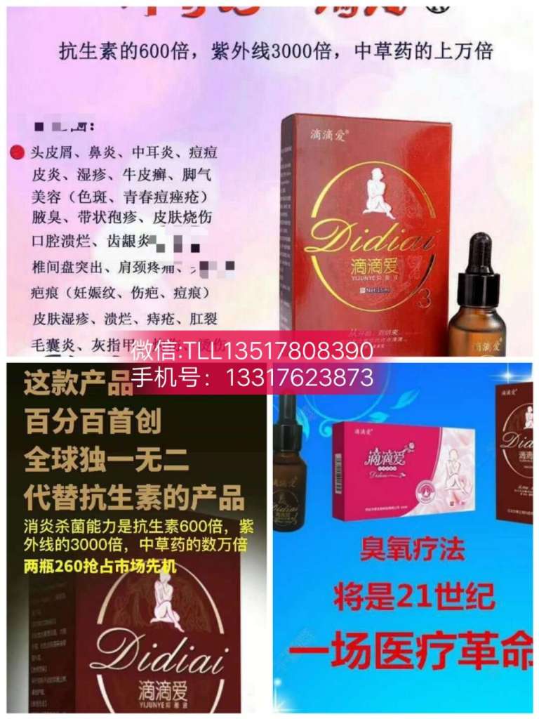 滴滴爱富含高科技臭氧原液,对于透皮杀菌只有高浓度的臭氧才能穿透人体皮肤5至7毫米,如果想要继续对下方的人体组织进行杀菌消毒,滴滴爱臭氧原液,就可以达到,因为臭氧滴滴爱的浓度相当接近人体承受极限范围内60到80/L,其透皮效果特别显著!臭氧滴滴爱是一款微商产品,同时也是抗生素最好的替代品,一款纯天然没有添加任何香精、激素的产品。滴滴爱主要针对真菌感染,消yan,杀菌,修复,净化等领域,包括头部,面部,呼吸系统,颈部,肚子,双腿,脚部等一切皮肤问题,适用范围广泛,男女老少都可以用的产品。