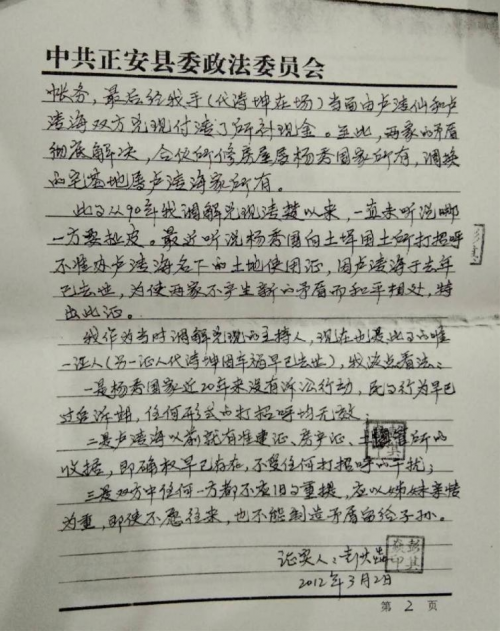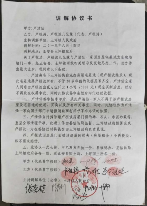 2013年6月14日,由土坪镇人民政府主持调解。调解以卢清仙家为甲方,其长子杨勇、三女婿帅辉、四女婿付林等三人到场,并分别在调解书上签了字;以卢祖波家为乙方,其兄卢祖涛、二姐夫郑继伦、三妹夫詹正雄三人到场,也分别在调解书上签了字。