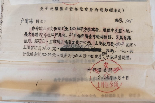 1985年10月,杨秀国履行了土地调换,并无偿交由卢清海建房的协定。1986年2月,卢清海占地341.82平方米的院落在土坪新街落成。