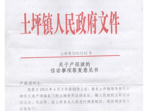 2012年6月,卢祖波以继承人的身份,向土坪镇人民政府提起信访督办请求。同年底,土管所介入复核丈量程序。不料,杨秀国的儿子杨勇竟然冲进卢祖波家里,强行阻止卢祖波在复核表上签字,还狠狠地打了他两记耳光,并威胁说要整死他。