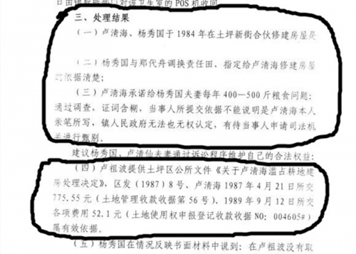 “2009年12月,杨秀国夫妇以‘1985年,移交宅基地给卢清海建房时,卢清海自认每年向其交付400-500斤大米作为租金。事后,卢清海一直不予兑现’为由,向本部门提起了‘不予办理’的请求”卢祖波展转来到国土部门时,工作人员这样告诉他。