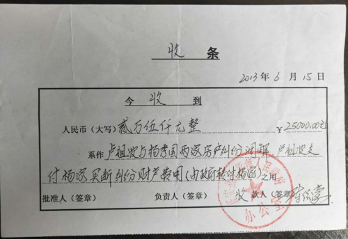 6月15日,土坪镇人民政府办公室以“卢祖波与杨秀国两家房产纠纷调解,卢祖波支付杨秀国家买断纠纷财产费(由政镇府转付杨家)”为名,足额开出了收条。
