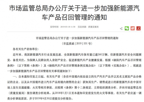 3月18日,市场监管总局办公厅发布《关于进一步加强新能源汽车产品召回管理的通知》。