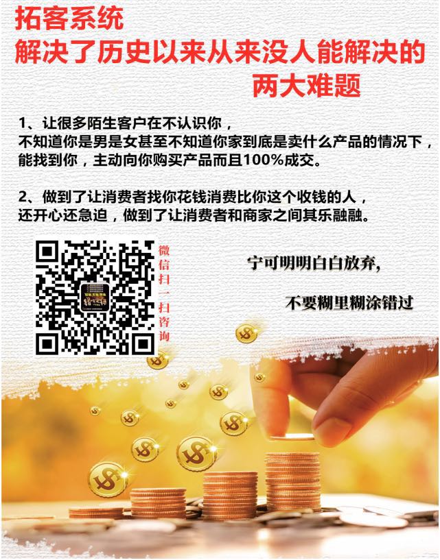 拓客系统从始至终都是用户和用户之间通过微信,支付宝,现金发生的交易,完全去中心化,系统不收费,不卖货,不扣点,不经手,不分红,不返利,没有奖金制度,没有双规对碰,没有任何和传销挂钩的东西。包括客户也加在你的微信里,流量也在你自己手机里。系统只是一个拓客工具,和微信一样从始至终免费使用,给大家提供技术服务,云计算匹配客户匹配订单而已!前提是你卖的产品一定要合法哦。