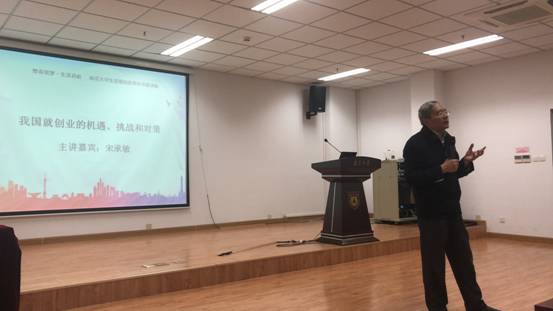 图为宋承敏司长在南京某大学开展《大学生创业》讲座,正在以老虎堂的成功案例为正面教材授课