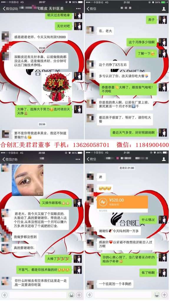 市面上自营品牌加盟商店家三百多家,有各个地区的美容院店家,微商团队几千人,君君见过各种各样的美业培训平台,对比过很多这种美业培训机构,其他很多类似平台都是没有落地的东西,君君董事之所以选择和和创汇美合作,从一开始的小白到现在拥有自己的团队,是因为她们公司产品实实在在的教技术,技术非常好,第二 就是产品都是目前市场上最好的原材料产品。尤其是祛斑产品和技术,效果特别好,还有干细胞也是最好的干细胞,无针技术也是最好的!所有产品都是目前最火爆的美容项目!合创汇美项目怎么操作,是真实存在的吗