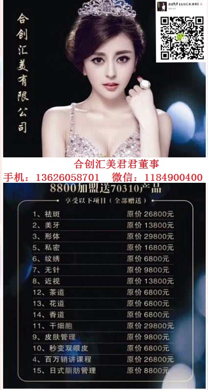 创汇美是做什么的?与传统美容项目不同,合创汇美为高科技微整形项目,同时拥有专属的模式。合创汇美模式属于教育机构模式,加盟合作即可免费学习所有项目。可以学20几个市面最火爆的项目!公司送产品+仪器给你,选择你喜欢的套餐,可以学什么呢?1.双眼皮2.无针医美⑤⑥个项目3.祛斑4.纹绣5.德国埋线溶脂6.私密7.干细胞脸部精雕、丰胸,私密等8.花道9.茶道10.香道11.美睫12.美牙13.形体14.近视项目15.近视调理等……