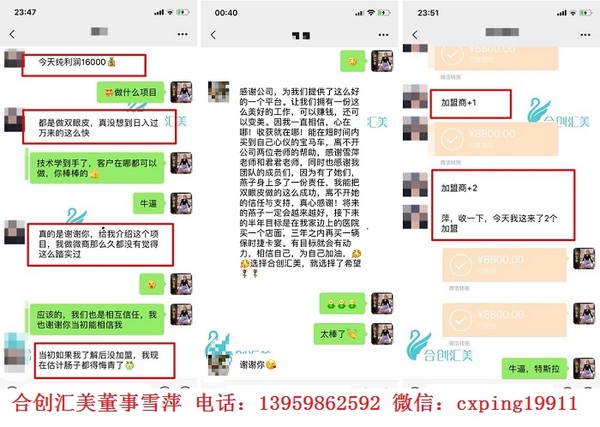 任何一次机遇的到来,都必将经历四个阶段:看不见、看不起、看不懂、来不及。每一次的机遇的到来都会造就一批富翁合创汇美雪萍团队这是一个拥有了梦想拥有灵魂的团队,让无数无数的草根成功的逆袭!让无数的家庭的妇女重新拾了梦想,收获美丽和事业!无数的社会的最底层的青年,没背景没家世没文凭或者没容貌,绝望之际,加入微直销,加入我们!通过团队的培训,自己的努力,一步步改善生活,改变命运!如果你有梦想,如果你需要有改变那就赶紧加入我们合作~8800元可送70310产品~后期拿货1拆拿(无限货量)