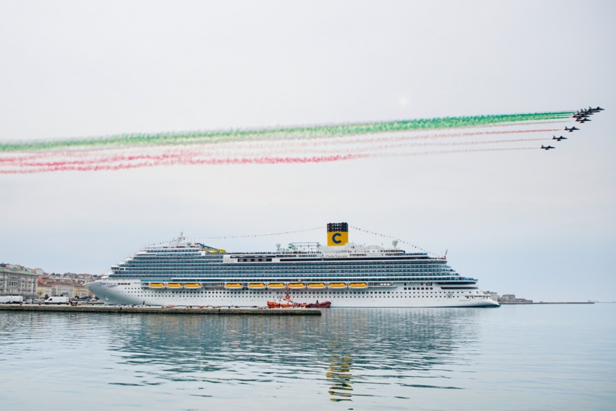 庆典当天,意大利国家三色箭飞行表演队在码头上空呈现了一场非凡出色的飞行表演,寄予的里雅斯特美好的祝福。歌诗达·威尼斯号命名仪式由此正式拉开序幕。