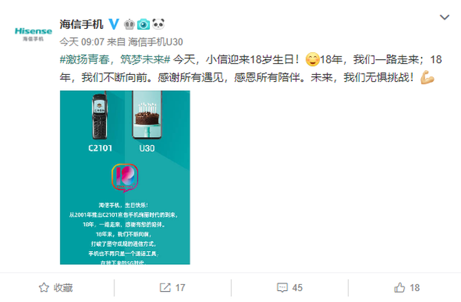 青岛海信通信有限公司成立于2001年5月10日,距今正好18周年。今天上午,海信手机官微放出了18岁生日的祝贺:今天,小信迎来18岁生日!18年,我们一路走来;18年,我们不断向前。感谢所有遇见,感恩所有陪伴。未来,我们无惧挑战!