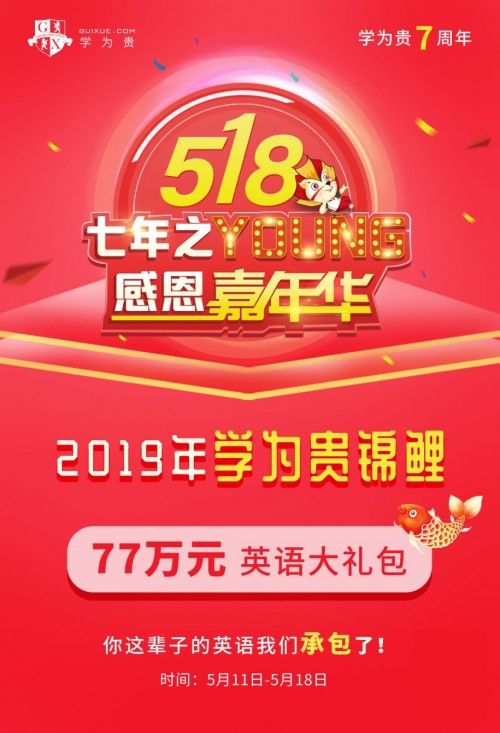 对于贵粉而言,每年的5月18日都是一个值得纪念的日子。尤其在今年的5月18日,学为贵迎来了7周年庆,为回馈广大的新老学员,学为贵好礼相送,推出“学为贵七周年——七年之Young感恩嘉年华”活动,诚意满满地为学员们奉上了大礼。