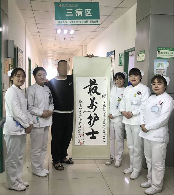 放心住院了的马腾依然心事重重,肝病患者总是面临着巨大的心理压力,来自社会,来自家人,来自自己,这样的压力甚至让七尺男儿独自落泪。马腾住院时正是农历腊月,眼看年关将近,病友纷纷出院,家人也不在身边,加上肝病患者容易心情不好,他经常在病房里哭。一次,病区护士长李晓平看到了,就坐下来劝解他,耐心开导,陪他聊天,帮他解决烦恼,有了家人般的陪伴,马腾心情好了许多。了解到患者压力非常大的李晓平护士长嘱咐每个护士,有时间多来开导马腾,输液打针做治疗都要聊上两句,他没有家人看护,有什么生活起居的需要也要多加关心,这让马腾真正感受到了什么是待患如亲一般的医疗服务。他说:“三病区这护士们我个个都能叫上名来,王静璐,韩颖,陈曦,两个苗苗,还有晨晨……,我知道这些琐事小事不是她们工作内容,做不做都是无可厚非的,可她们还是打心眼里关心病人,病给好好治,精神状况也给治好,再也找不到这样一群好护士了,我觉得她们就是最美护士!就像白衣天使一样。”