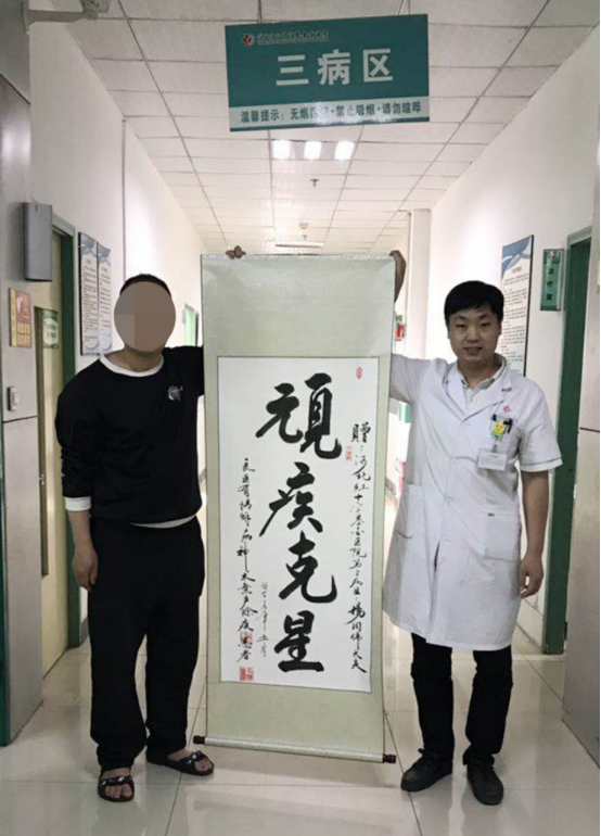 这次复查的马腾各项指标正常,肝脏大小有所回长,结节缩小,蜘蛛痣消失了,精神头非常好,再也没有动不动就累的情况发生,吃饭也有食欲了,消化也正常了,恢复到了正常人的生活,重新回到了工作岗位,闲暇时还能拿出毛笔重拾写毛笔字的兴趣。这次复查为了感谢医生和护士的付出,他特意写了几幅毛笔字,精心装裱好送给杨医生,李护士长和三病区的全体医护人员以表深深的感谢之情。