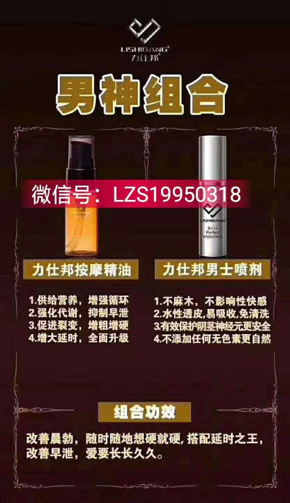 力仕邦按摩精油——增粗,增硬,助勃起,增加性爱乐趣,提高精子数量和质量,有效根治阳萎,早泄,中途疲软,精液不液化,阴囊潮湿,前列腺炎,一步到位。两个产品都有华泰保险公司承保,药监局备案,安全有保障。力仕邦延时喷剂一瓶10毫升,可以用五六十次。