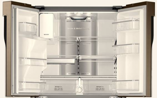 "品式"结构是三星在产品设计上的又一次创新。冰箱的上半部分被设计成大型冷藏空间、左下部分是冷冻室、而右下部分则是可灵活调节温度的宽带变温室,三个间室整体呈现"品"字型。据了解,这种设计能最大限度地扩展冰箱内部容积,最高可达611升。