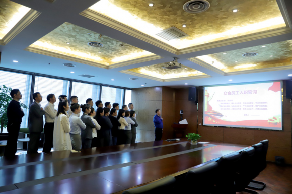 2019年5月14日,众合天下事业部总经理李晓带领全体新员工进行了新一届的员工入职宣誓仪式,以“同宣誓、共奋进”为仪式主题。总经理李晓与公司新员工一同宣誓了“听党话跟党走,服从众合领导;忠诚众合事业,牢记众合使命;铭记众合宗旨,弘扬众合文化;严守众合秘密,维护众合利益;执行众合决定,永做众合先锋;携手众合之力,共铸众合辉煌”的誓词, 表明各自为众合天下“成为卓越的全系统服务机构”的目标而努力奋斗的决心和信念。