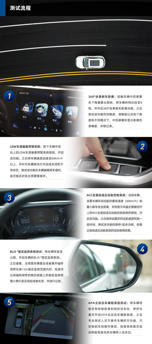 本次主要是针对福特领界的360°全景倒车影像、APA主动泊车辅助系统、BLIS ®盲区监测系统、LDW车道偏离预警系统、ACC全速智能自适应巡航控制系统进行专业的评测。