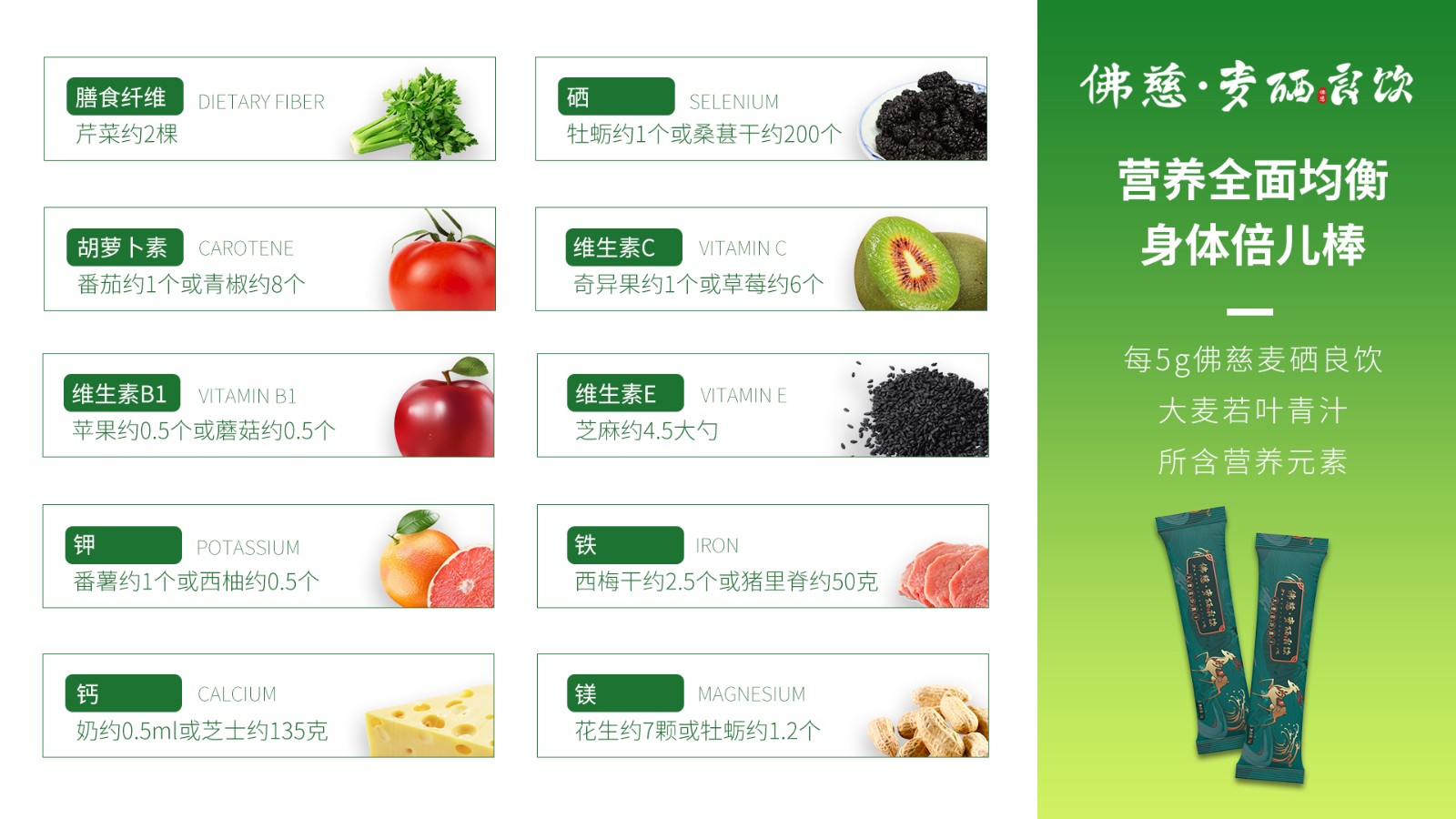 佛慈麦硒良饮大麦若叶青汁中含有丰富的膳食纤维,能促进肠胃蠕动排出毒素,分解脂肪;因为自有农场土地硒含量超高,因此生产的青汁产品中也含有大量硒元素,有抗癌、抗氧化、增强免疫力等功效;叶绿素含量更是同类产品的2倍之多,具有净化血液、消炎杀菌的作用; 更富含活性维生素、铁元素和钾元素等营养成分,长期食用,不仅仅是润肠通便,还能改善睡眠质量和调理粗糙、长痘的肌肤。