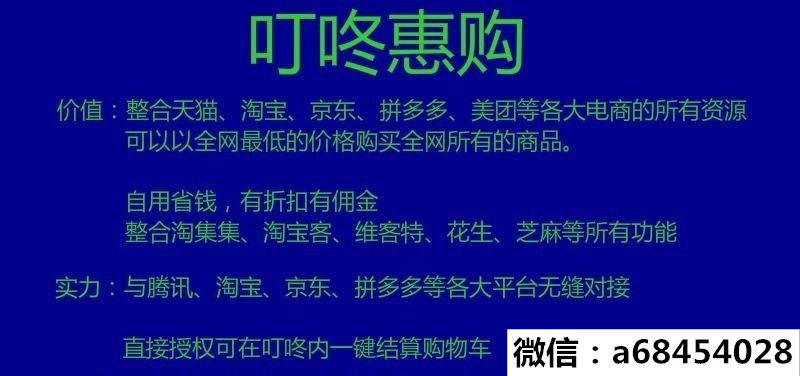 与腾讯、淘宝、京东、平多多等各大平台无缝对接,整合各大电商的所有资源,可以全网最低价的价格购买全网所有的商品,直接授权可在叮咚惠购内一键结算购物车,自用省钱,操作方便简单,又实惠!注册邀请码:1888888(有邀请码才能注册)