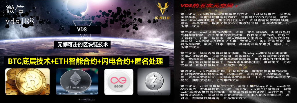 VDS没有经过任何的基石轮、天使轮、私募、公募等等敛财噱头,上线之前也没有任何的路演和推广等等常见的流程和手段。就是这样一个在没有项目方、没有资本方、匿名技术团队的“三无”项目,上线伊始,便是主网+手机APP+PC段挖矿+商业模式架构+精美绝伦的大片官宣均已经成型的成熟的区块链,白皮书各项功能完成度达到80%,仅此一项,对币圈链圈的项目是一种秒杀和无情碾压,可以形象称之为“降维打击”!任何区块链项目想要做到这样的完成度,要求的绝不仅仅是高超的区块链编程技术,所有的财力支援、模式架构、商业思维、团队协同都是成功的关键,更难得的是VDS长达几年的开发时间,外界竟对此一无所知! 并且众多的线索串联起来却发现和中本聪及比特币有着千丝万缕的联系。。。由于时间关系这里就不多说了。需要的私聊VX:vds188