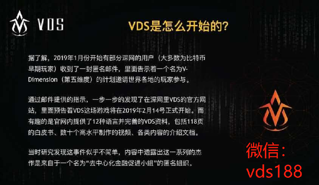 2019年新年伊始,一个叫V-Dimension(简称VDS)的神秘项目在币圈和链圈悄然兴起,诸多退隐江湖的币圈大佬,也因为VDS的独特魅力,重新开始了布道之旅而更多的积极参与者则拥有同一个特点,他们都是错过了当比特币崛起的币圈新一代。VX:vds188