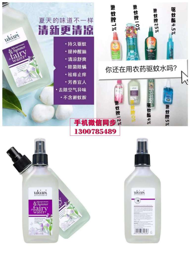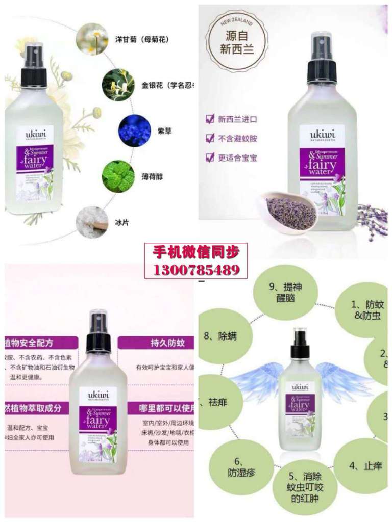 有了母菊和其它植物成分,无需避蚊胺,散发出来的气味就会 让蚊虫非常恐俱、避而不及。精灵水对抗蚁虫,是因为里面各种植物成分本身的功效,而并非一些化学成分,因此,睡觉前在身上、房间里喷几下,不仅可以远离蚊虫骚找,在给幼嫩的宝宝使用时,也会更加的安全。纽西小精灵的系列产品甄选新西兰特有的植物成分。而其他驱蚊水上面明文写的孕妇禁用,农药字号,微毒!我们的可以去食品药品监管局查询,安全到可以喝。