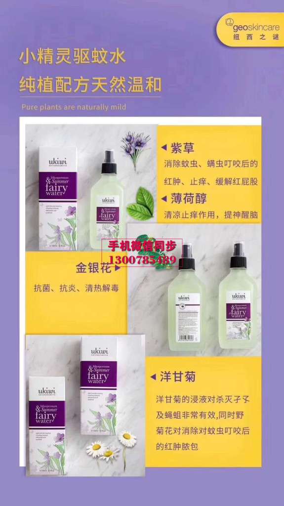 geo纽西夏日精灵水,原装新西兰原装进口,纯净无添加化学成分。精灵水的主要成分是母菊、紫草、金银花、薄荷醇和冰片, 纯植物配方,成分温和,不含驱蚊酯等农药成分,不使用人工色素、人工香精、重金属等有害成分,坚持100%新西兰原装进口,使用更安心。纽西优品精灵水可以喝.可以喝的驱蚊水,孕妇宝宝随便什么状态都可以用喷在皮肤上清凉冰爽。因独特的品质产品远销美国、澳大利亚、日本、韩国、澳门、香港等国家和地区,深受消费者的喜爱。