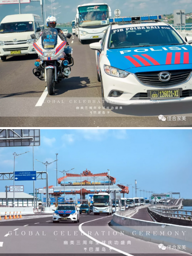 浩浩荡荡的幽美队伍,全程在巴厘岛警车的护卫下出发!磅礴盛大的气势,在巴厘岛唯美热带风光的映衬下,整个幽美车队熠熠生辉,每个幽美人都倍感自豪。