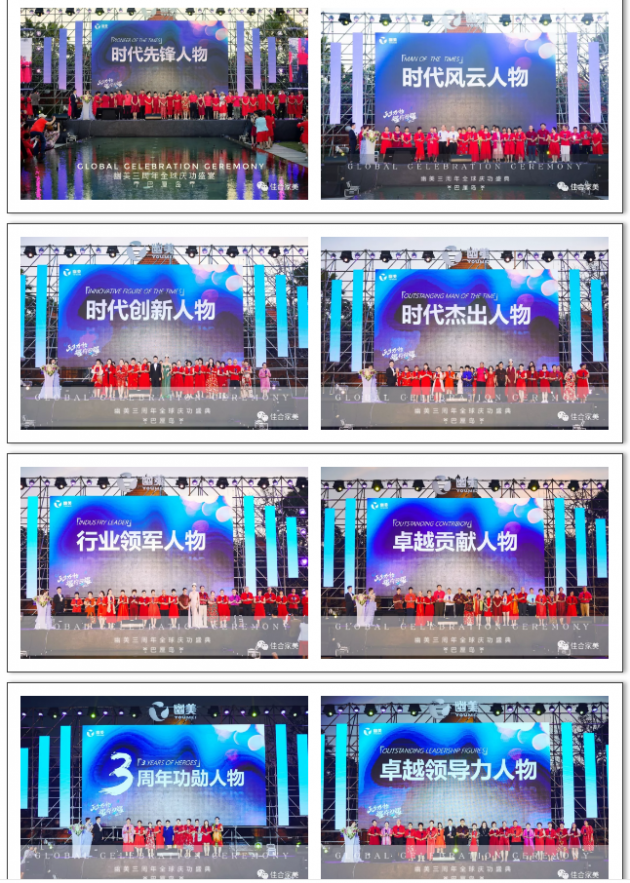 荣誉的颁发,不仅是对取得优异成绩的市场精英们的肯定,更是对幽美家人们的激励。在千余名家人们的见证下,盛典现场共颁发8大奖项:时代先锋人物、时代风云人物、时代创新人物、时代杰出人物、行业领军人物 、卓越贡献人物 、卓越领导力人物 、3周年功勋人物。三年蜕变之路,成就幽美传奇!所有奖项是对他们努力的肯定。幽美,因为这些优秀的家人们而变得更强大。