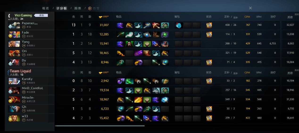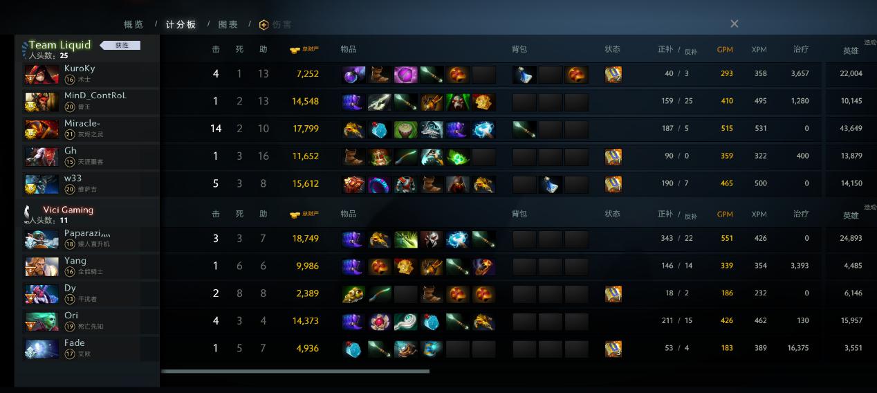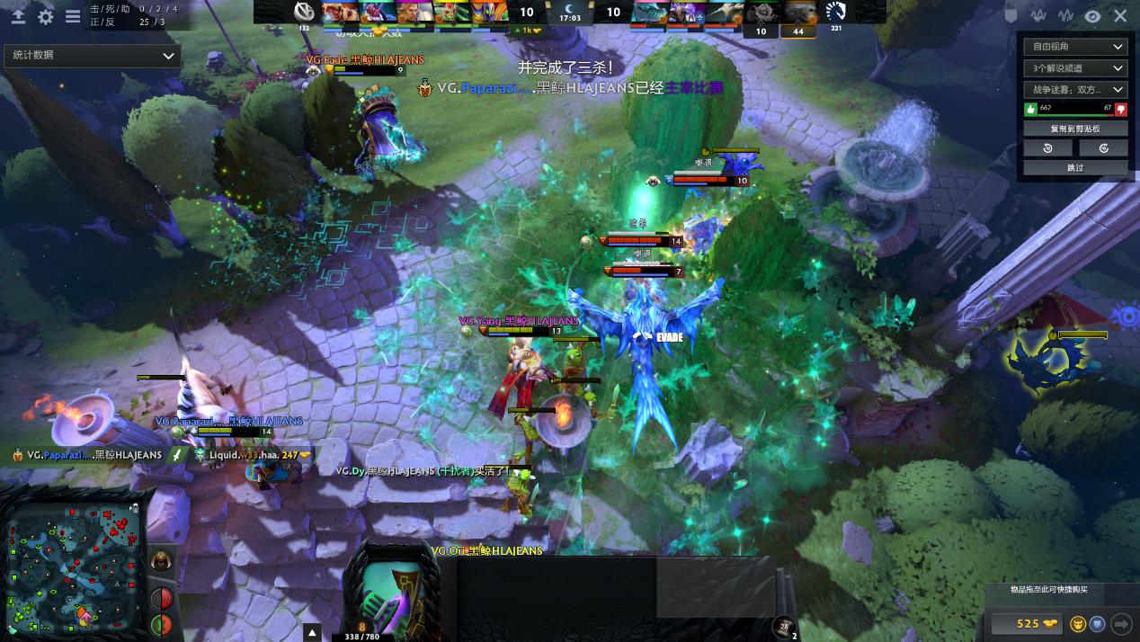 23分钟VG开雾,双方在夜魇二塔再次爆发团战,发条勾住边缘拉比克和其一换一,液体以为没有控制的VG失去了最重要的战斗力想击杀VG双核,怎奈VG的拉扯实在是过于流畅,皮队全能骑士奶量无比充足硬生生保住了丝血的美杜莎和巨魔,反而再次击杀复活的发条和DP,Liquid一波溃败。