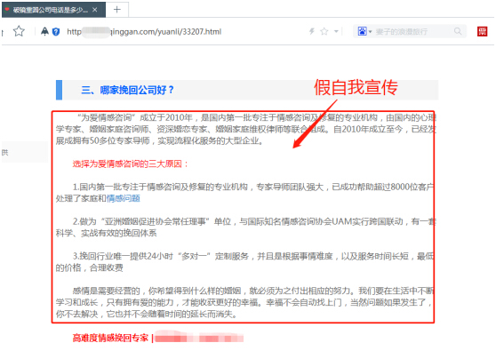 有不法分子在抄袭我司文章后,利用搜索引擎的搜索规则,在标题和文章首段插入破镜重圆的品牌名和介绍,在末尾加入自己的虚假宣传引导语,来对消费者进行误导。
