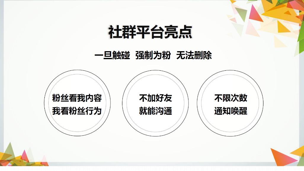 4、用户反馈:1)用户在浏览社群内容时,群主在APP端能收到超过10种行为反馈可以进行反馈,沟通的内容也能进行剖析,让企业知道怎样才能更好地进行社群营销,让更多人感受到社群的魅力。;