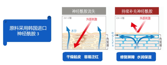 对肌肤保湿修护有良好作用,是角质层中重要的活肤成分,能增强皮肤屏障,重建细胞,形成有效的屏障来防止水分流失和减少外部环境的影响。有研究表明,擦含有神经酰胺成分的产品能减少红肿和经皮水分流失,起到增强皮肤屏障并帮助受损肌肤缓解干燥状态的作用。