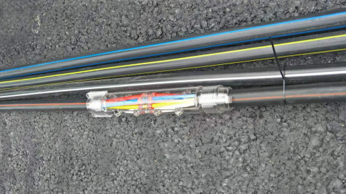 同一处沟内铺设两根以上硅芯管时,用不同颜色的色标区分开来,以便后面施工。每间隔10米用专用塑料扎带绑扎一次,以增加硅芯管的挺直性,确保硅芯管无杂乱无缠绕。硅芯管在检测井的余留长度不小于400mm,硅芯管进检测井的排列按照施工图纸,按上下两层,分色标连接管道。