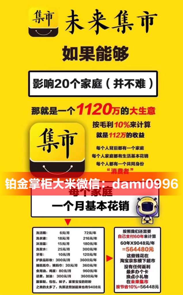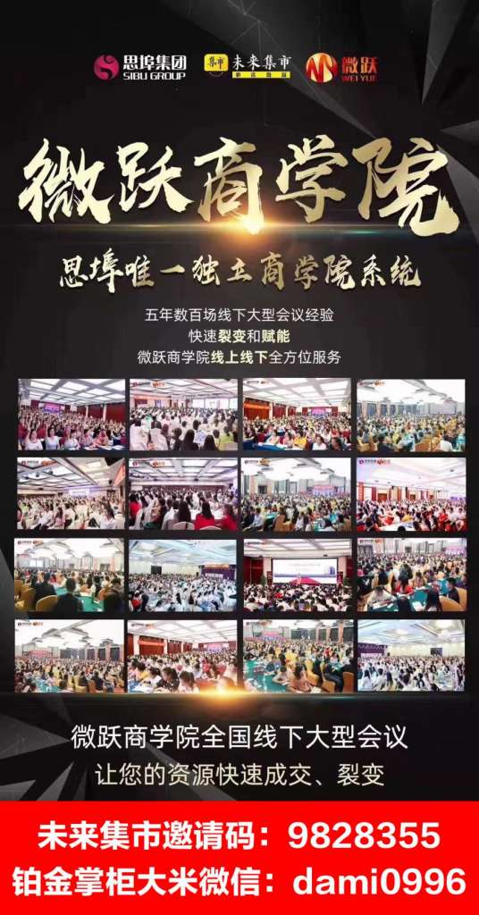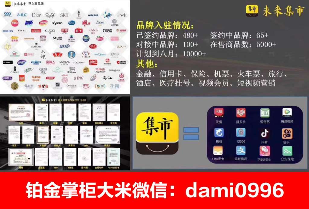 未来集市五年磨一剑,重新定义社交电商,带领我们站在一个巨大的风口上,给自己搏一次机会,不要徘徊不要犹豫,机遇把握了也就把握了,错过就真的错过了,给自己一次机会,干比想更重要,我再这里等您,与您一起成长,家人们一起干!详情咨询未来集市铂金掌柜大米微信:dami0996 电话:13826900996