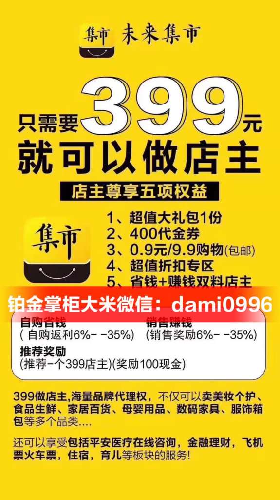 总而言之,未来集市的优势是很大的,其最为重要的亮点就是可以让每位用户在平台中都创造出属于自己的价值,获取丰厚的收益和回报。参与未来集市平台的话,你可以以店主的身份模式参与其中。成为未来集市的店主,不管是谁只要是选择了未来集市店主发出的注册开店礼包链接的话就可以成为店主,而不需要任何其他的资质。详情咨询未来集市铂金掌柜大米微信:dami0996 电话:13826900996