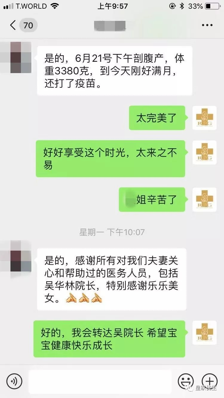 7月21日,RFG皇家医院的工作人员小乐也收到了客户H先生发来的好消息:“6月21日下午剖腹产,体重3380克,今天满月,还打了疫苗。感谢所有对我们夫妻关心和帮助过的医务人员……”