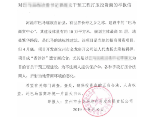 8月8日,因法定代表人被“非常规”刑事羁押4个多月,经其代理律师多次提出取保请求遭拒,且相关媒体予以关注并多次跟进报道,仍未能维护其合法权益,迫于无奈,广西“巴马商贸中心”开发商——宜州市金龙房地产开发有限责任公司(以下简称:金龙公司)对巴马相关部门人员进行了实名举报(见下图)。