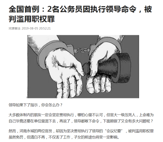 日前,河南永城的两位官员,因为坚决贯彻执行了领导的“会议纪要”,被判滥用职权罪(见下图),这是否给巴马相关部门的官员敲响了警钟?