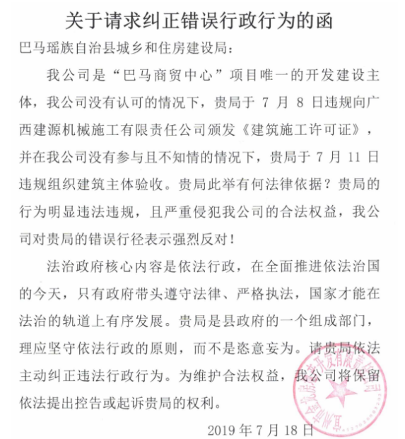 金龙公司开发建设的“巴马商贸中心”项目,因故于2016年4月停工,金龙公司与广西建工集团建筑工程总承包公司解除施工合同后,于2019年1月与广西宝光明建设有限公司签订《建筑工程施工合同》,并委托合作方广西瓒凡投资有限公司的代表人廖团芳依法申请变更《建筑工程施工许可证》。2019年7月初,在金龙公司不知情的情况下,广西瓒凡投资有限公司擅自清退广西宝光明建设有限公司,先后自行与中跃建设集团和广西建源机械施工有限公司签订《建筑工程施工合同》,并擅自到住建部门申请办理《建筑工程施工许可证》变更登记手续。住建局在没有金龙公司申请以及提供《建筑工程施工合同》必要证件和资料的情况下,违法给广西建源机械施工有限公司颁发了《建筑工程施工许可证》。金龙公司发现这一情况后,分别于2019年7月11日、7月18日向巴马住建局呈送《声明》、《关于请求纠正错误行政行为的函》,请求其自行纠正行政违法行为,住建局既不纠正,也不做任何解释。