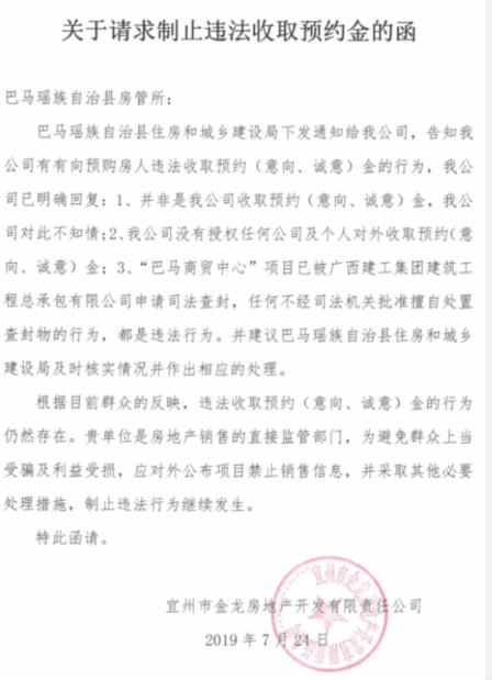 金龙公司《关于请求制止违法收取预约金的函》