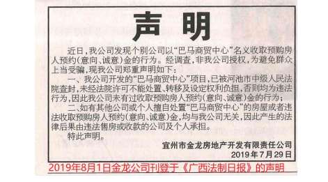 金龙公司在《广西法制日报》刊发的《声明》
