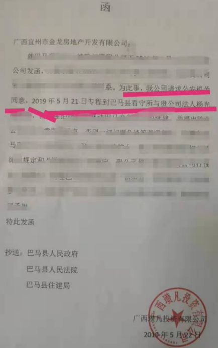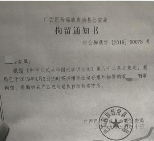 果不其然:2019年3月30日,有知情人告诉金龙房地产相关人员,说金龙房地产得罪了某官员,提醒其小心。2019年4月3日19时许,杨光隆在广东老家被巴马警方跨省带走,并以涉嫌非法储存爆炸物罪的案由将其刑事羁押至今已120多天……