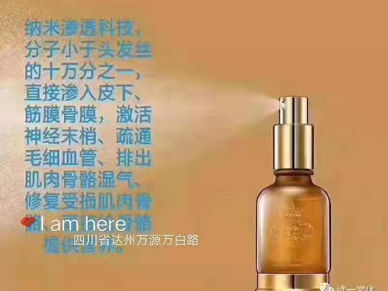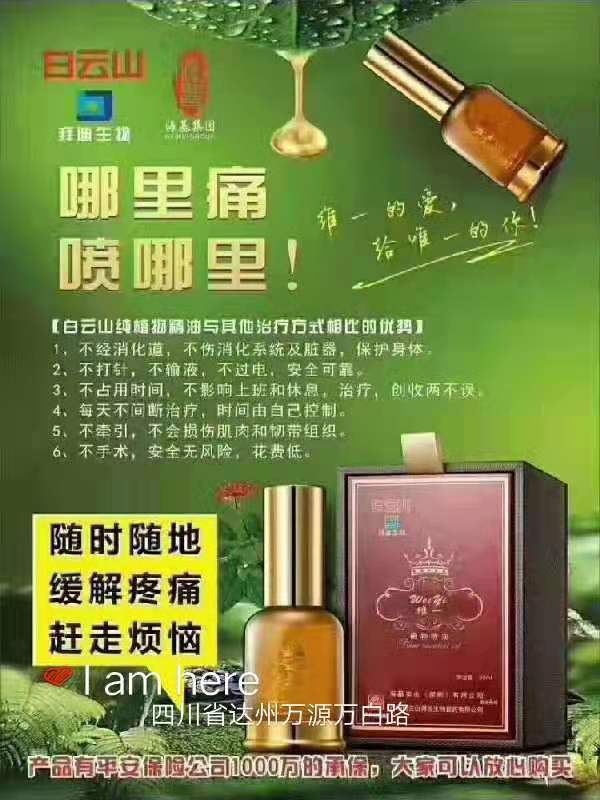白云山精油――由广州白云山拜迪生物制药厂生产,是广药白云山和深圳海基集团联合打造的一款神器!由多种中药植物精纯提取,运用纳米渗透科技,经皮肤吸收直达病灶。不需调配,不需推经络,对风寒湿邪毒,经络瘀堵等引起的肩颈不适,腰腿疼痛,关节炎等有改善,调理和治疗作用。名字虽然不是药却甚是药。哪里不舒服喷哪里。该产品由平安保险公司承保一千万,目前列为出口免检产品,远销海外。