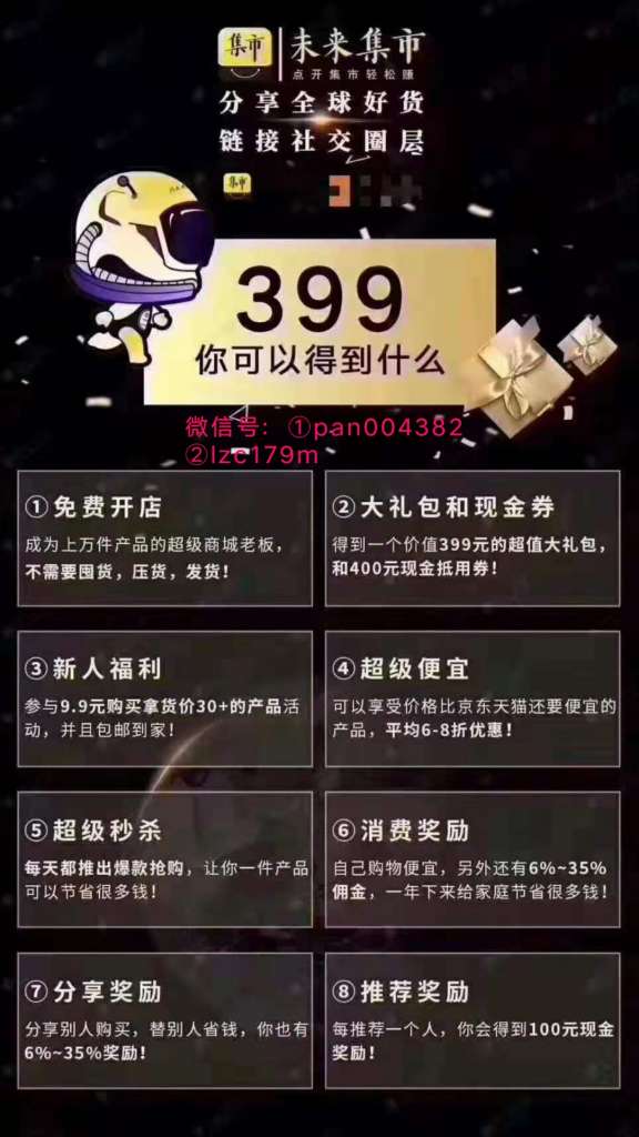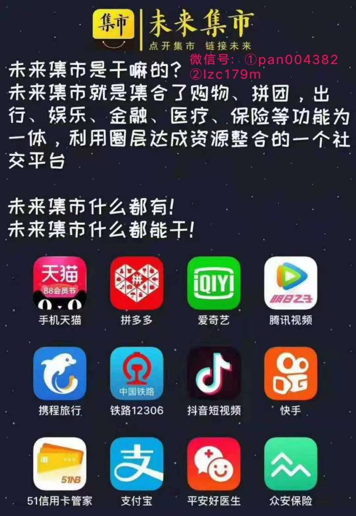 未来集市是在2019年轰动一时的社交应用类圈层电商移动端APP,简单来说就是一个可以按照不同圈层,推送合适商品的APP,别人通过社交分享,实现链接资源分享全球好货,不仅让买卖变得更简单,让店主创业更简单。第一团队刘总微: ①pan004382 ②lzc179m