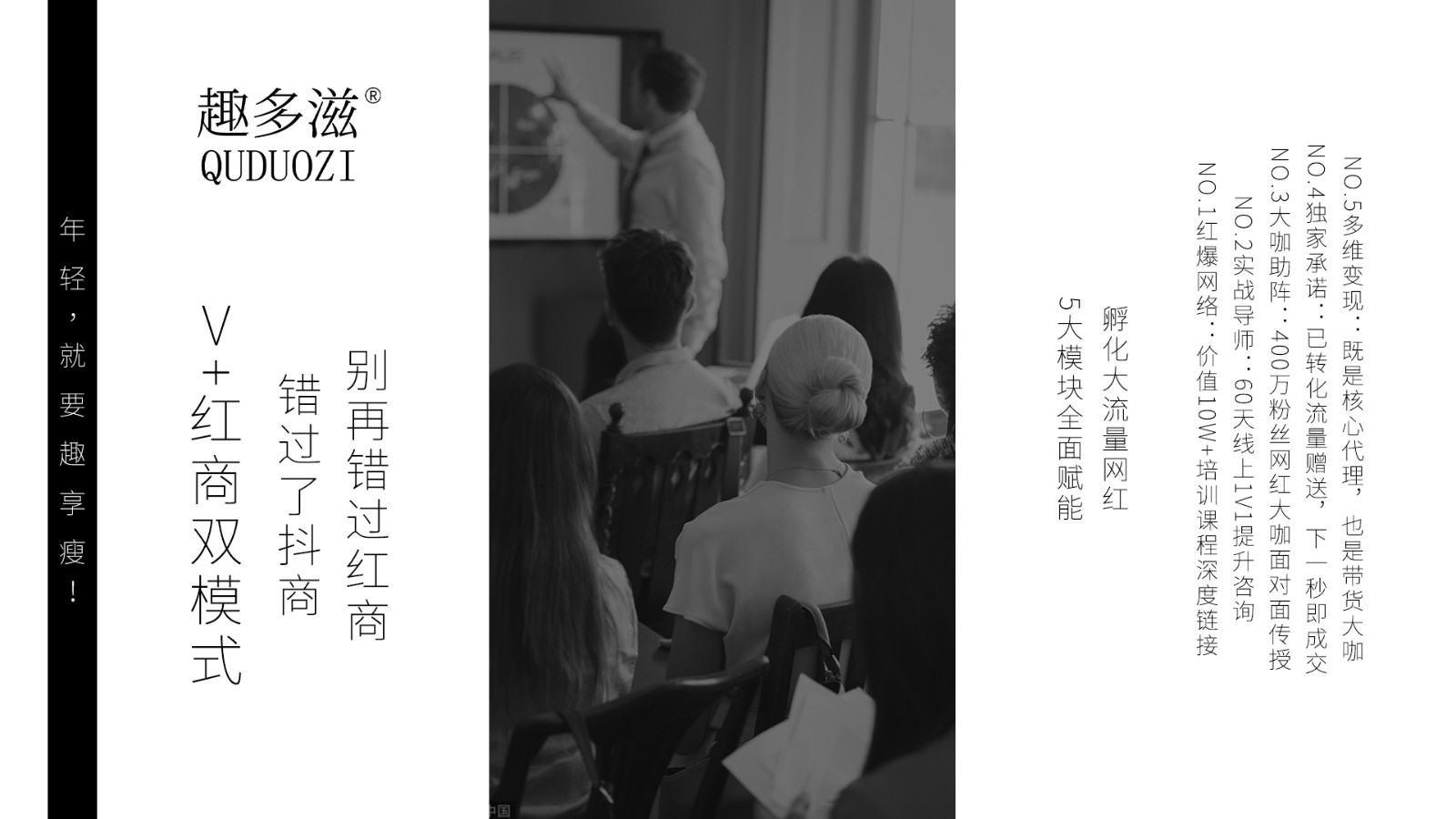 1、独有V+红商双模式,通过五大模块全面赋能代理人群,加入趣多滋你可以拥有:价值百万+的培训课程;实战导师帮扶;百万粉丝网红助阵授课,千万粉丝网红面对面交流;送代理,打造流量工厂;N重变现:打造标杆团队长,助你成就网红梦!