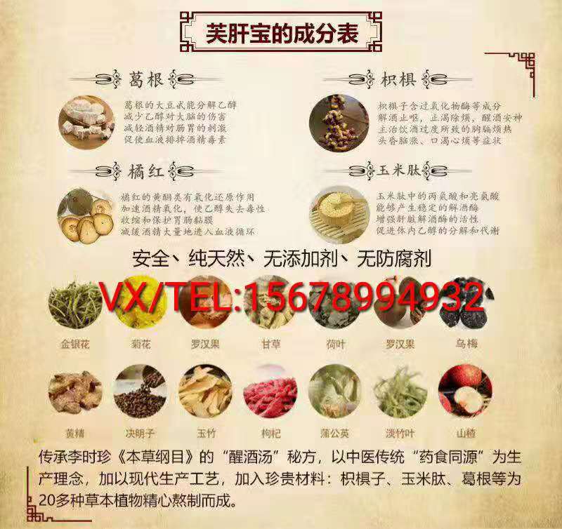 芙肝宝是一款源于李时珍的本草纲目秘制的古方,经过中科院的医学博士多次改良和增加现代工艺,并由国家卫生部颁布的“药食同源”的草本植物食材熬制而成,成分天然、珍贵、安全、效果显著!芙肝宝“醒酒”只是我们的一个切入点,产品立竿见影的效果,它还有以下功效:养肝护肝、醒酒、防宿醉、眼睛干涩明目、祛痘、淡斑、清咽润肺!芙肝宝的使命和责任:让中国中药和自然古法养生之道造福全人类!把中国中药变成中国饮料,古法养生、美满人生!芙肝宝多种名贵中药成分相互作用,排毒养颜解油腻,润肠护肝还解酒,芙肝宝是一款养肝护肝、护肠胃、调理亚健康的神器啊。