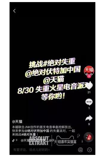 故事开始之前,8月20日,天猫就参加了绝对伏特加的#绝对失重#抖音挑战赛,并同步发布了天猫联合JNK创作的首支电音单曲《Absolut Gravity Z》抢鲜版,将天猫的喵声与打开APP时候的气泡声,与酷酷的电音进行结合,呈现音乐“上头”,身体即可放松的失重感。