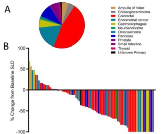 图B:每根柱子代表一个dMMR患者在接受Keytruda治疗后20周肿块大小的变化情况。很大一部分患者肿块缩小,部分患者缩小的比例为100%,也就是完全消失。